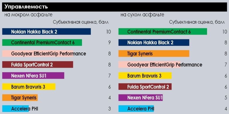 Первым этапом теста стала проверка управляемости на мокром асфальтированном покрытии. Оценки выставлялись по субъективным ощущениям пилотов по 10-балльной шкале. В этом "упражнении" первое и второе места заняли шины Nokian и Continental соответственно. В тесте на управляемость при езде по сухому асфальту лидировали эти же шины, но на этот раз первое место досталось комплекту покрышек Continental.