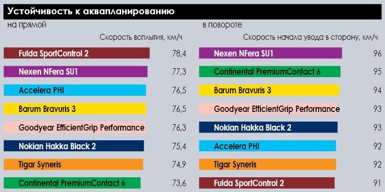 Следующий этап проверки - анализ устойчивости шин к продольному и поперечному аквапланингу. На прямой дороге лучший результат продемонстрировала летняя шина Fulda SportControl 2, тогда как на извилистом треке первенство неожиданно завоевала резина корейской марки Nexen, а Fulda сместилась в самый низ списка.