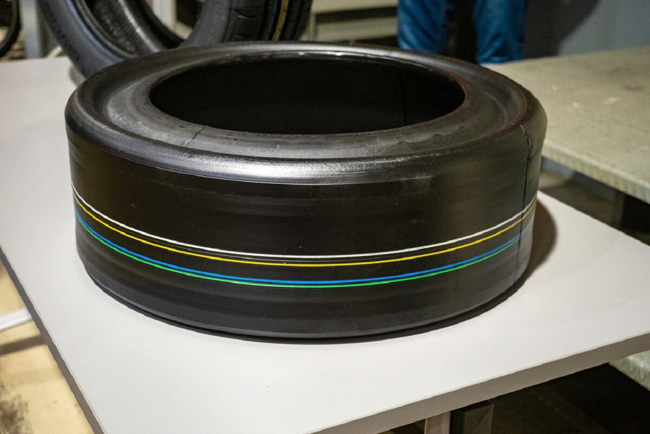 Заметили отсутствие дренажных канавок, грунтозацепов и ламелей? Тут много резины, поэтому площадь контакта покрышки с дорогой максимальна. Но при любом малейшем дожде авто на таких шинах вылетают с дороги, если не успели вовремя заехать на пит-стоп и переобуться в дождевую резину.