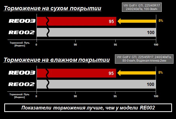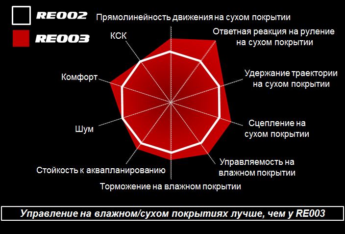 Наиболее улучшены управляемость, сцепление на сухом покрытии, по сравнению с моделью RE002, а также улучшились показатели комфорта, сцепления на мокром покрытии и сопротивление аквапланированию.