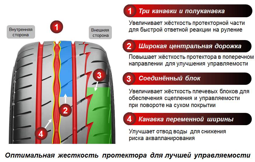 - объединённый блок – повышает жёсткость плечевых блоков внешней стороны шины для наилучшего сцепления и управляемости в поворотах на сухой дороге.