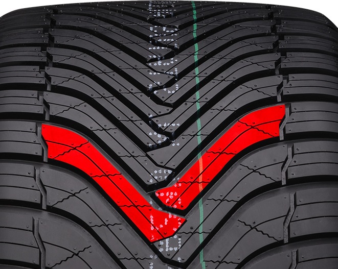 Всесезонные шины Грипмакс А/С имеют направленный V-образный узор с широкой центральной частью, в которой расположены крупные резиновые блоки с ламелями. Эта часть протектора непосредственно влияет на тягово-сцепные характеристики, сокращает тормозной путь, а также обеспечивает высокую курсовую устойчивость при скоростной езде по трассе.