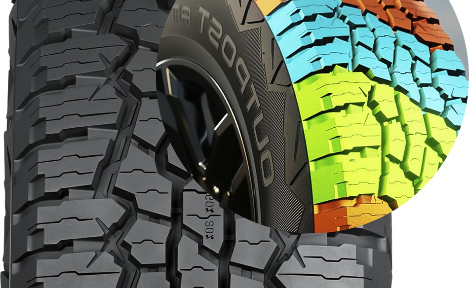 Все преимущества кевлара реализованы в шинах Nokian Outpost AT. В этих покрышках данный материал используется для повышения прочности боковин, которые часто испытывают перегрузки на ямах, камнях и кочках.