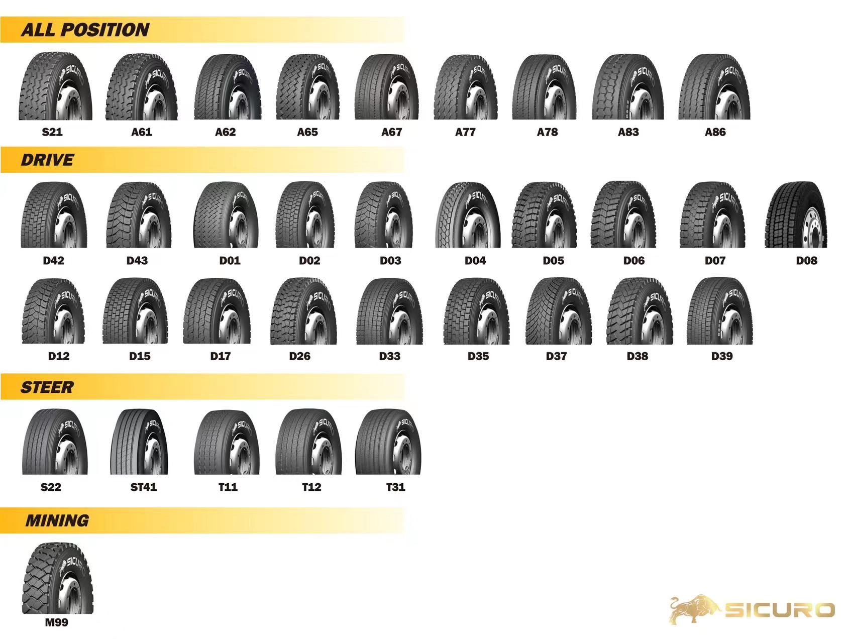 Существуют также универсальные модели TBR-шин, которые можно с одинаковым успехом использовать на любых колесных осях грузовиков и автобусов. По базовым характеристикам они, как правило, занимают промежуточное положение между специализированными шинами для рулевых и ведущих осей. Такие модели имеются и в ассортименте TBR-шин Sicuro.