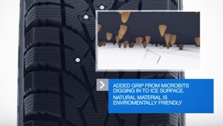 2. Инженеры применили собственную разработку – технологию Microbit. В резиновую смесь вошла измельченная скорлупа грецкого ореха, которую компания использует во фрикционных покрышках. Компонент цепляется за дорожное покрытие и улучшает сцепление на льду.