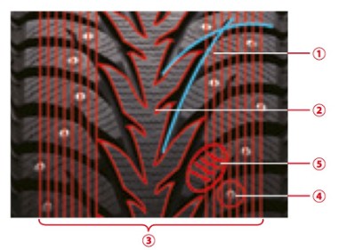 1. Закругленные поперечные канавки принимают массы снега и воды и выводят их за пределы контактного пятна, что предупреждает эффект аквапланирования. Продольные канавки улучшают тягу и отвечают за сбор жидкостей.
